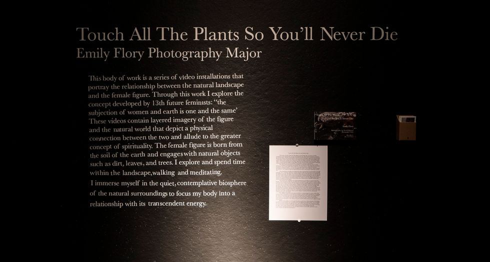 This body of work, Touch All The Plants So You’ll Never Die, is a series of video installations that explores the concepts developed by the 13th Future Feminists as well as the female figure, and the relationship with the natural landscape’s spiritual embodiments. Within these videos, the female figure is born from the soil of the earth and engages with natural objects such as dirt, leaves, and trees. When the figure interacts with these natural objects, these actions are delicate, as if these objects are an extension of its own body. These videos contain layered imagery of the figure and the natural world which depict a physical connection between the two and allude to the greater concept of spirituality